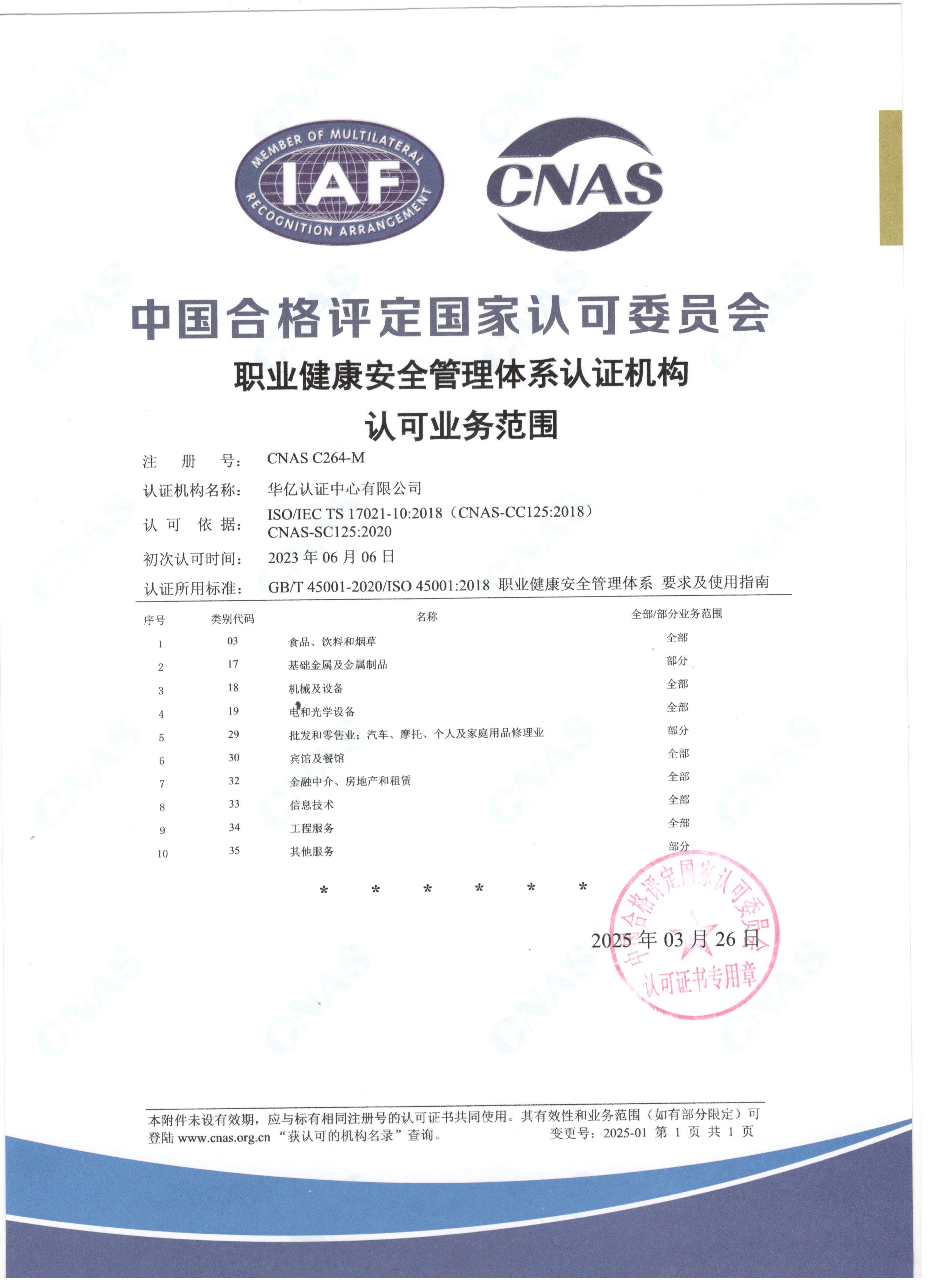 CNAS职业健康安全管理体系认证机构认可业务范围